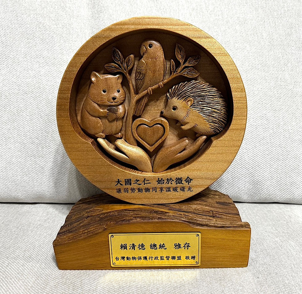 在交換禮物的時刻,聯盟致贈總統一件木雕作品。木雕中央,是倉鼠、刺蝟與小鳥圍繞著一顆心,由雙手托起。底座刻著八個字——「大國之仁,始於微命。」
